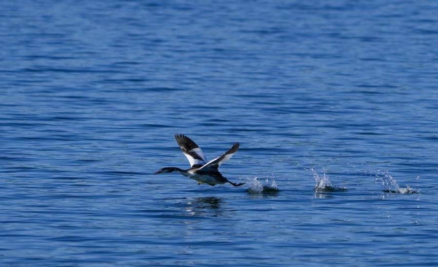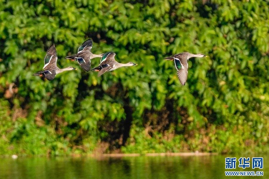在水面低飞的斑嘴鸭(12月27日摄)。新华网发(方雯青摄)